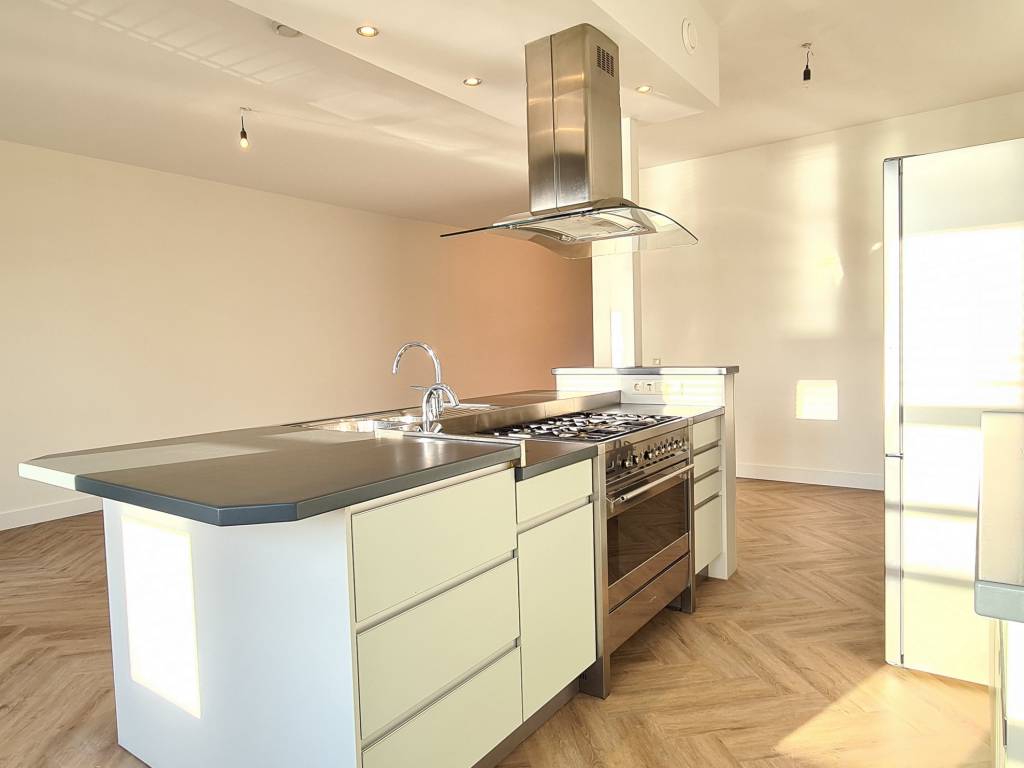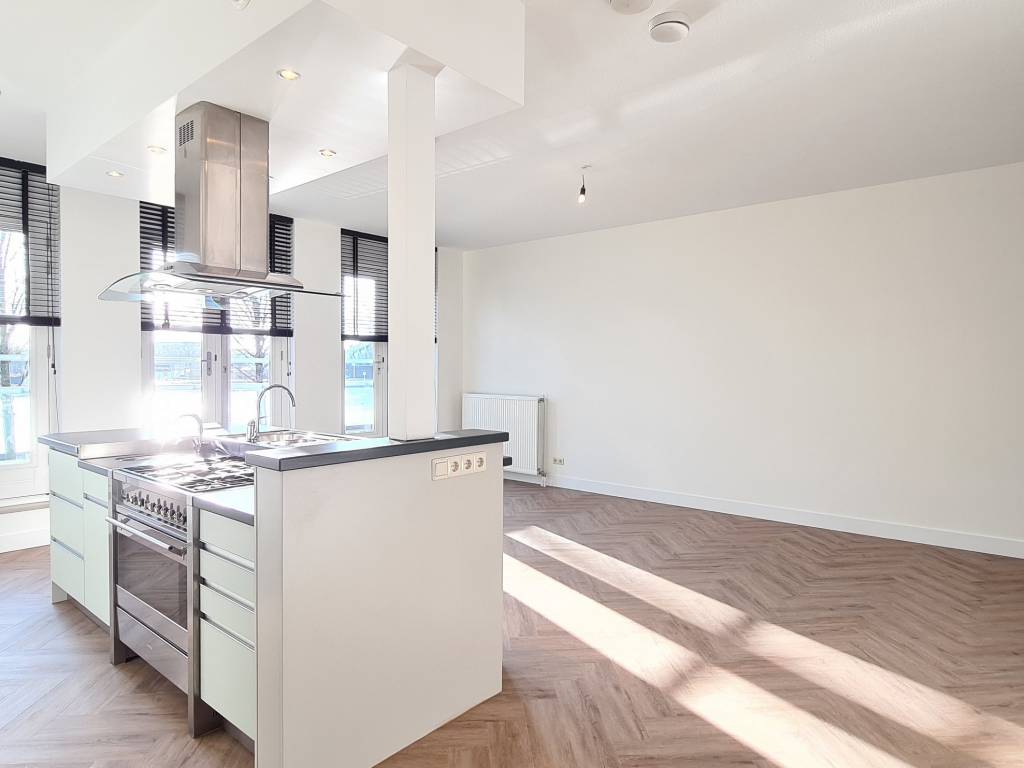 Conneted to the living room you will find the spacious kitchen. The kitchen (6mx6m) is equipped with build-in spotlights and a modern kitchen unit. Here you will find various built-in appliances, including a fridge and freezer, dishwasher, oven, 6-burner gas cooking with extractor. There is al lot of storage space in the various cupboards and cabinets. The kitchen-diner ares has French windows with French balconies over the entire width with a beautiful view over the Maas, the Willemsbrug and the Rotterdam skyline.