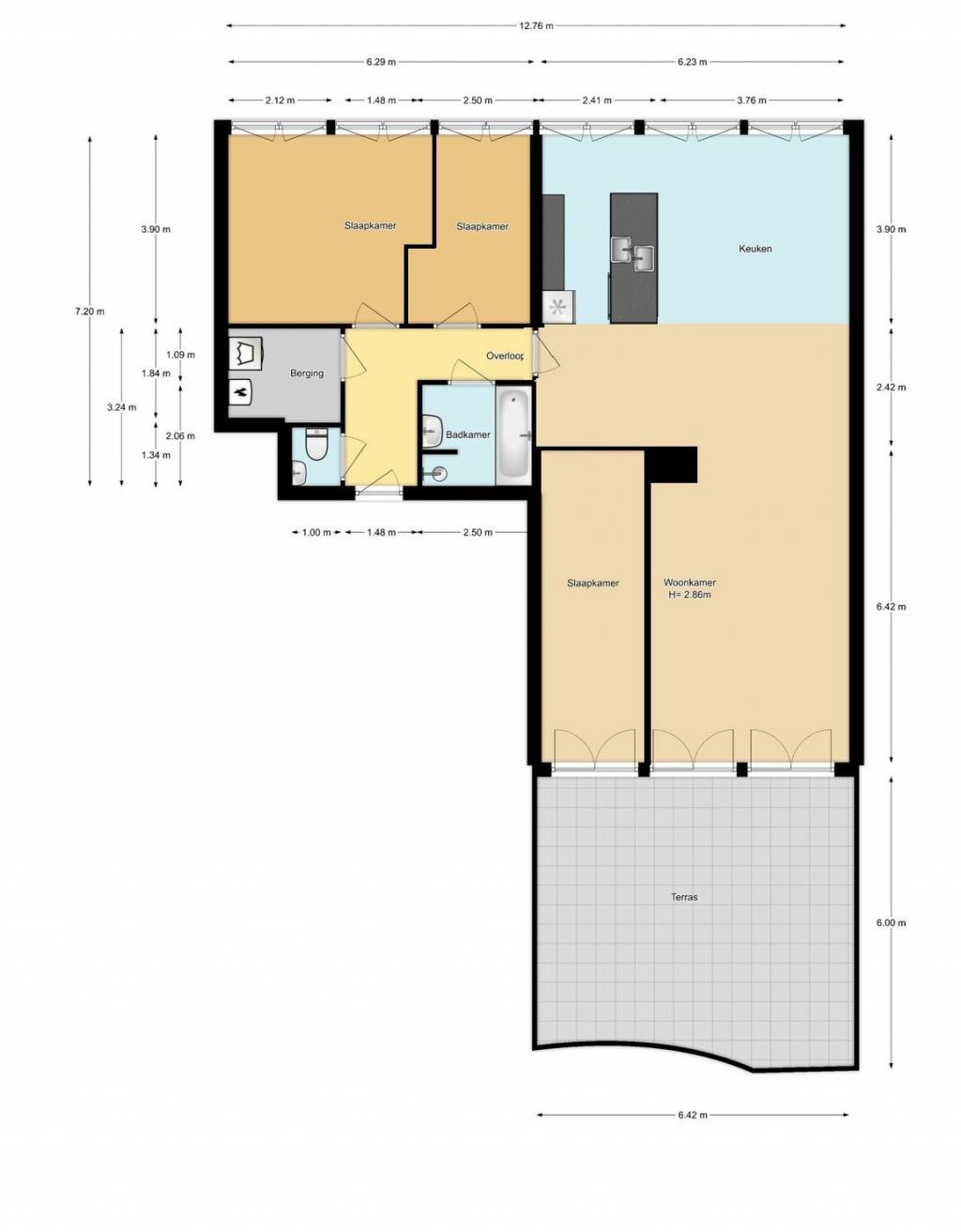 Entrance; from the hallway you have access to the living room, 2 bedrooms, the bathroom and the separate toilet. The living room of 13 meters (!) is divided in to a sitting room, a large kitchen dining area and access to the third bedroom. The living area (6.42mx 3.80m) is spacious with lots of natural light and the double doors give access to a large terrace (approx. 37 m2, northwest) located on a quiet square in the complex. The 3rd bedroom is also connected to the terrace.